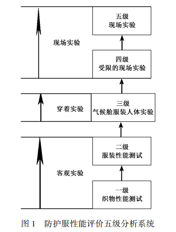 防化服的性能評價主要包含防護(hù)性能以及舒適性2個方面。 目前成熟的評價體系是五級分析系統(tǒng),如圖1所示??梢詣澐譃榭陀^評價、人體穿著實(shí)驗(yàn)以及現(xiàn)場實(shí)驗(yàn)3個層次。