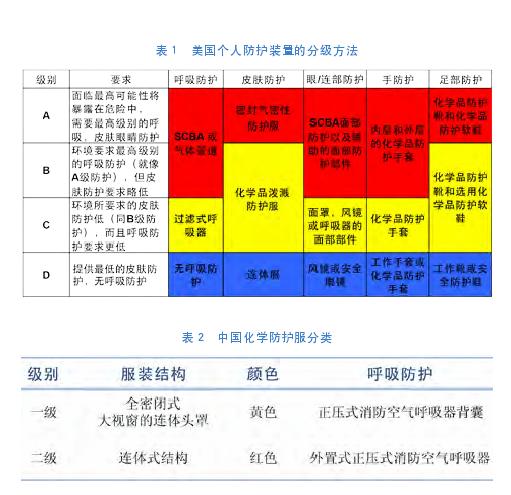 國(guó)內(nèi)標(biāo)準(zhǔn)GA 770-2008《 消防員化學(xué)防護(hù)服》中參考了USA的標(biāo)準(zhǔn),對(duì)化學(xué)防護(hù)服的分類標(biāo)準(zhǔn)進(jìn)行了簡(jiǎn)化,如表2所示。我國(guó)的一級(jí)防護(hù)裝備等同于USA的A級(jí)防護(hù),二級(jí)就是A級(jí)以下的防護(hù)裝備了。
