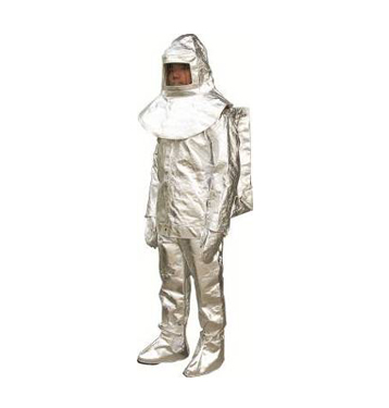 符合XF634-2006《消防員隔熱防護服》標準,用途:用于熱輻射強場所的全身防護。具備抗熱輻射、耐高溫、質(zhì)輕柔軟、防水等性能。在800-900°C熱輻射下,近火場高溫區(qū)。材質(zhì):鋁箔復合阻燃織物。組成:頭罩、上衣、背帶褲、手套、護腳。