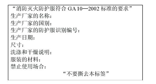 2、查看消防員滅火防護(hù)服是否有標(biāo)簽,查看標(biāo)簽內(nèi)容是否符合規(guī)定,每一件防護(hù)服應(yīng)有永久性的標(biāo)簽,標(biāo)簽應(yīng)放置在防護(hù)上衣前胸左側(cè)的舒適層上,標(biāo)簽上應(yīng)提供圖中所規(guī)定的內(nèi)容。