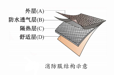 消防服由外層(A )、防 透 氣 層 (B )、隔熱層 (C)、舒適層(D)等層復(fù)合而成。阻燃性是外層 的基本要求;防透氣層的作用主要是防或有害物質(zhì)滲入,并將人體產(chǎn)生的汗液和濕氣及時排出;隔熱層要求具備良好的隔熱、防熱輻射性;舒適層提供與人體接觸的舒適性。多層織物復(fù)合形成消防服,需提供的主要性能是整體熱防護(hù)性、透水蒸氣性和舒適性。